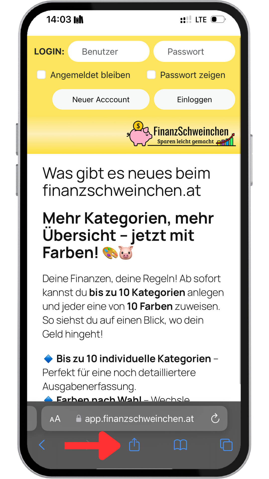 1. Die Loginseite am Handy aufrufen und auf dein Teilen-Button klicken.